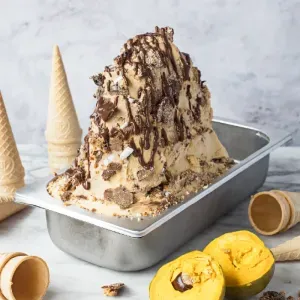 Gelato cremoso de lúcuma con crocantes y fudge de cacao belga, una combinación irresistible de sabor y textura.