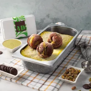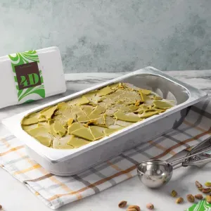 Cacao al 70%, pistacchio puro y kataifi original de los países árabes. Gelato que une intensidad, cremosidad y un crocante inigualable.